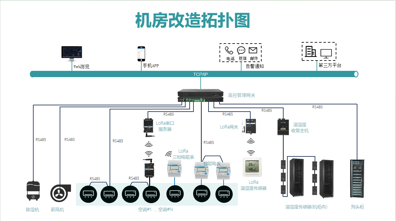該系統設備由:監控管理單元、溫濕度傳感器/收斂主機、機柜溫度集中采集模塊、LORA傳感器/網關/電表/串口服務器組成