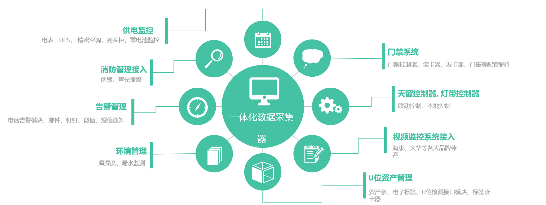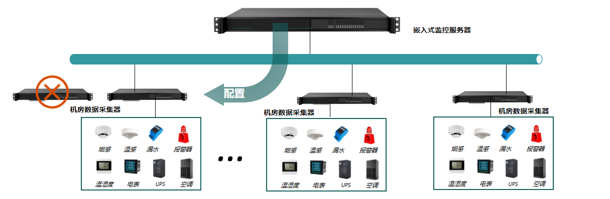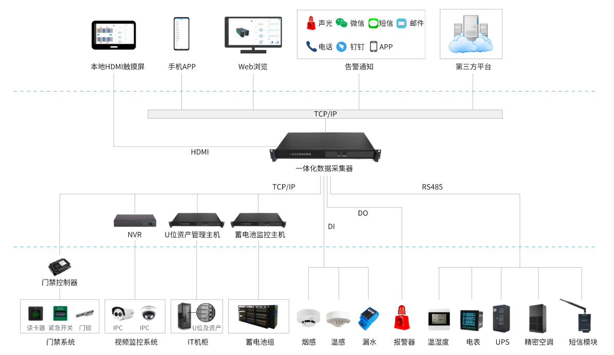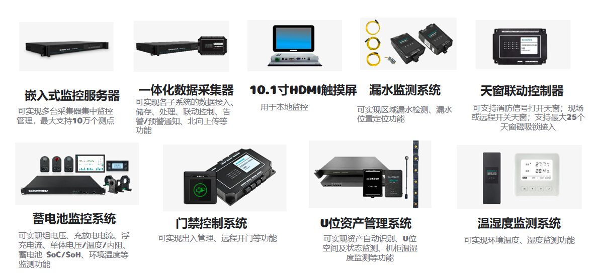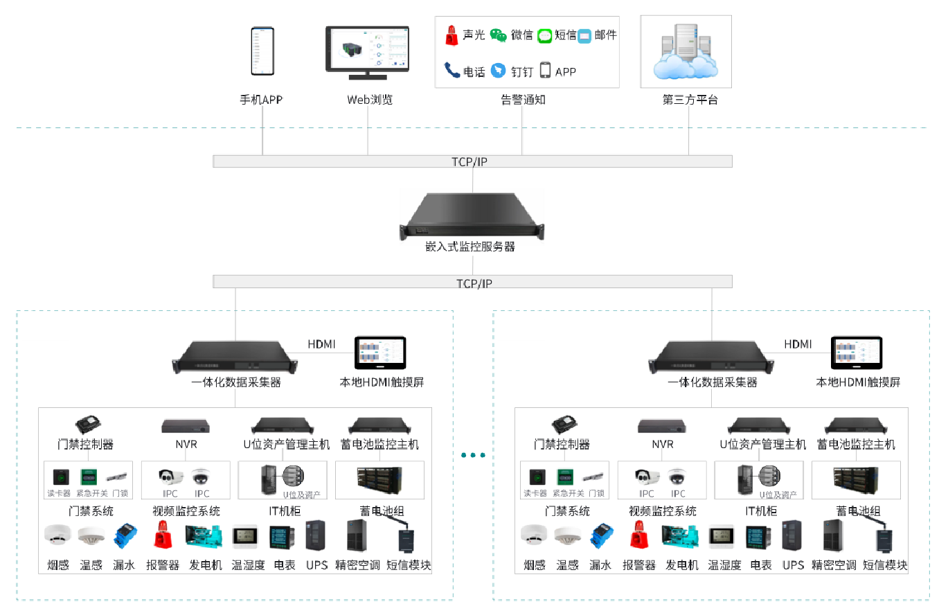 該系統由:嵌入式監控服務器、一體化數據采集器、HDM觸摸屏、漏水監測系統、天窗聯動控制器、蓄電池監控系統、門禁控制系統、U位資產管理系統、溫濕度監控系統組成