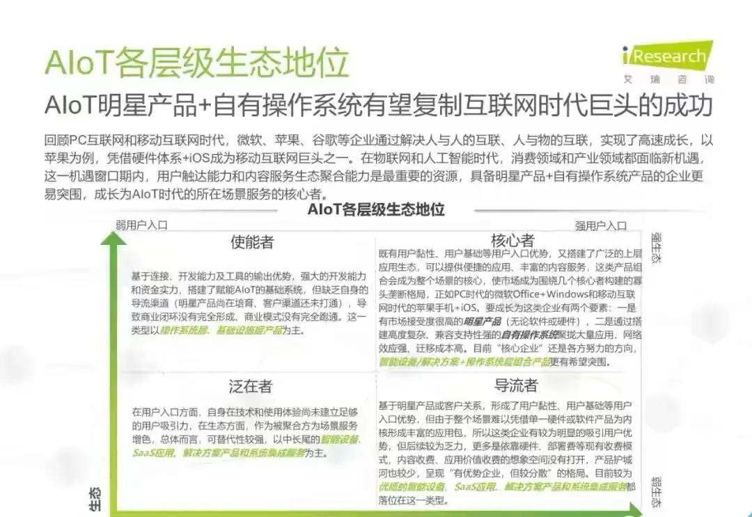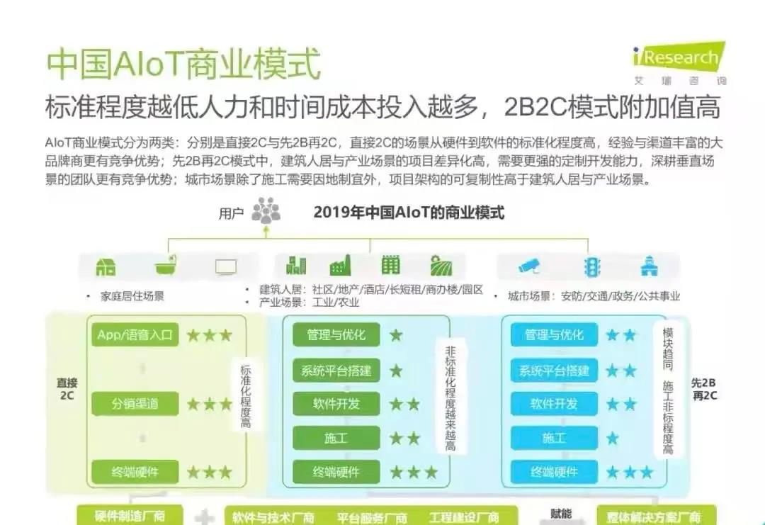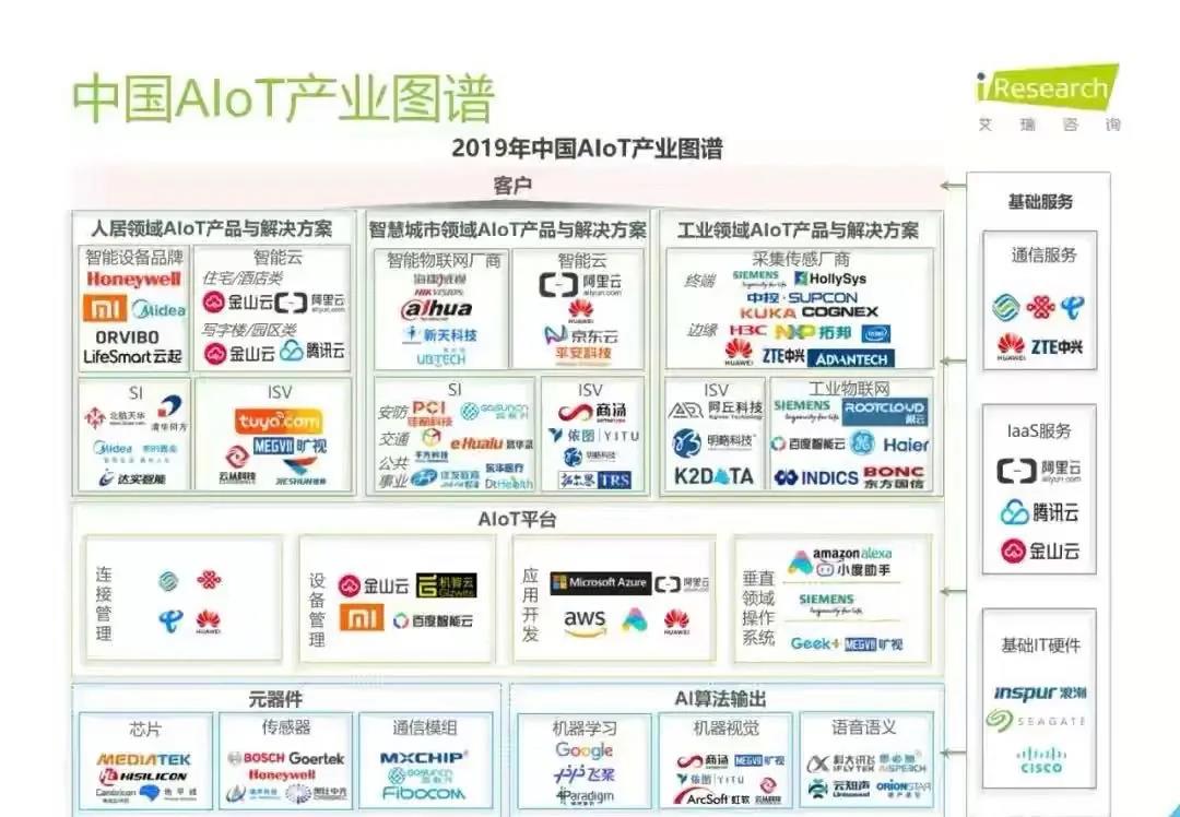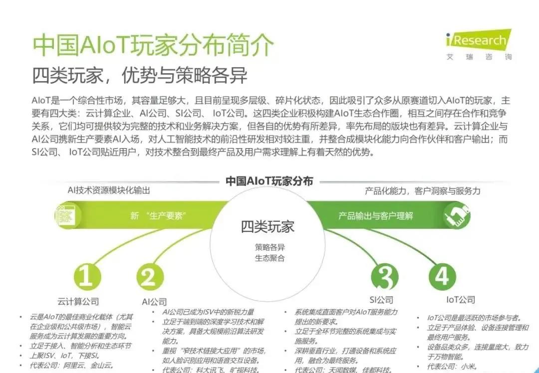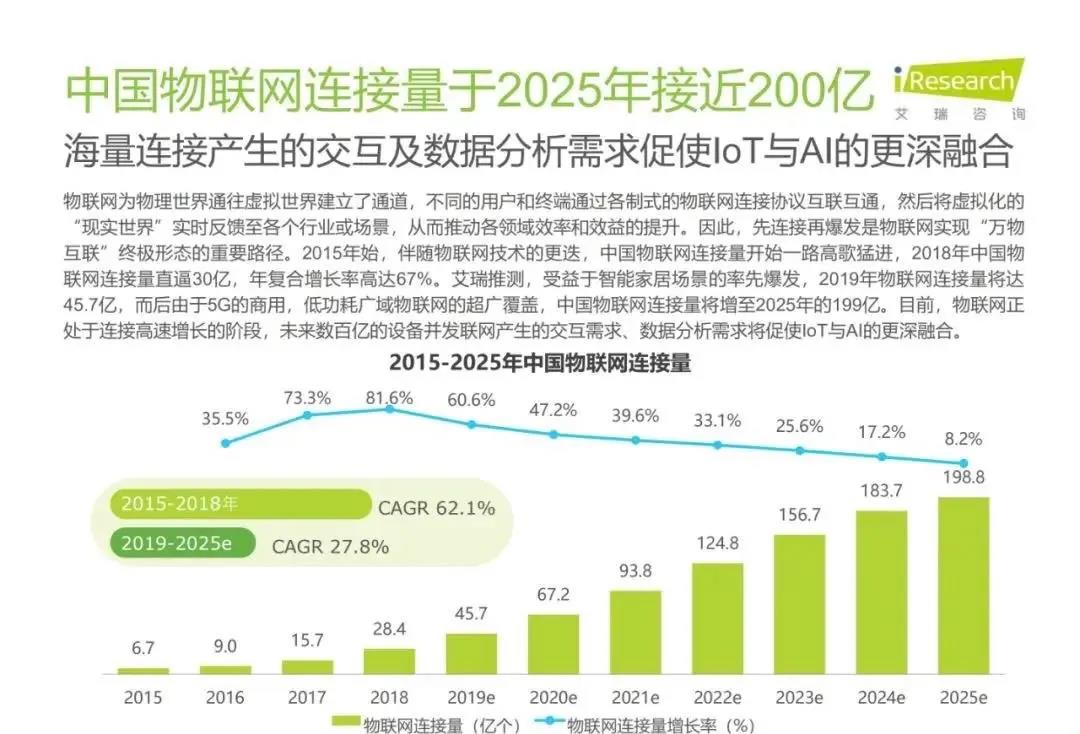 白皮書指出,AIoT是一個綜合性市場,其容量足夠大,且目前呈現多層級、碎片化狀態,因此吸引了眾多從原賽道切入AIoT的玩家,主要有四大類:云計算企業、AI公司、SI公司、IoT公司。艾瑞推測,受益于智能家居場景的率先爆發,2019年物聯網連接量將達45.7億,而后由于5G的商用,低功耗廣域物聯網的超廣覆蓋,中國物聯網連接量將增至2025年的199億。