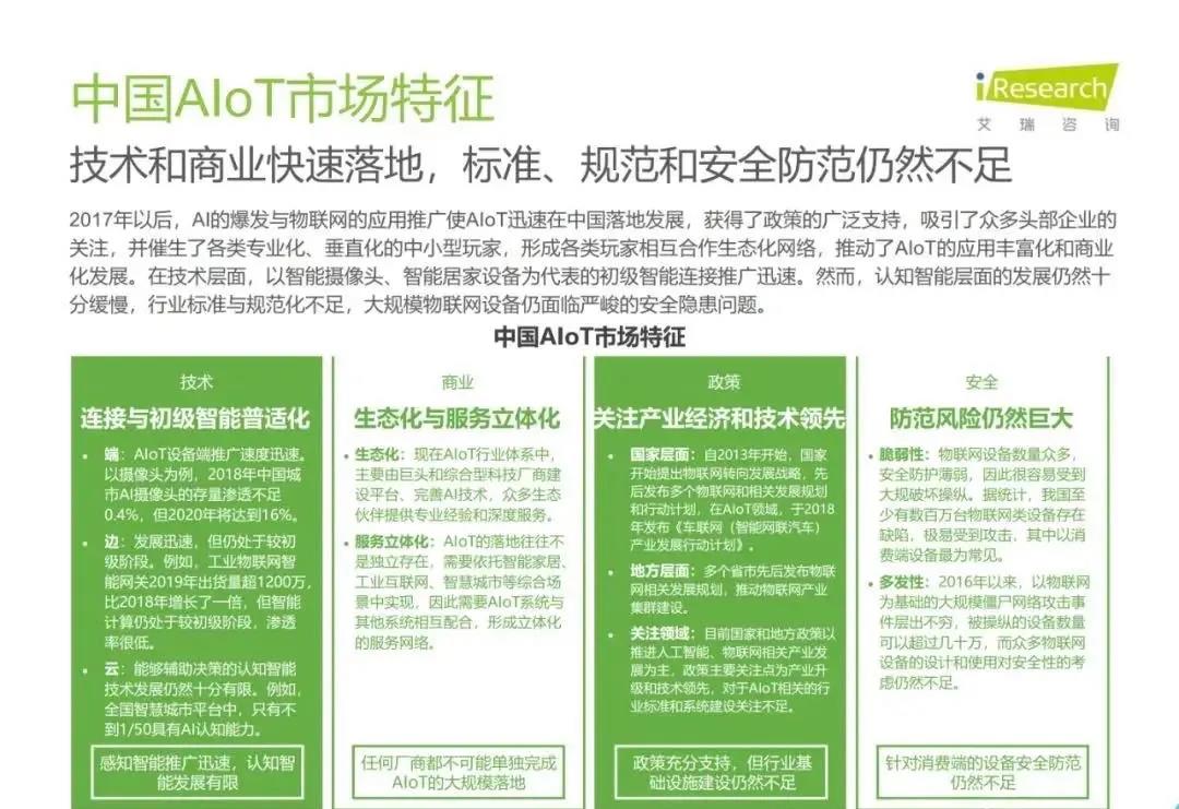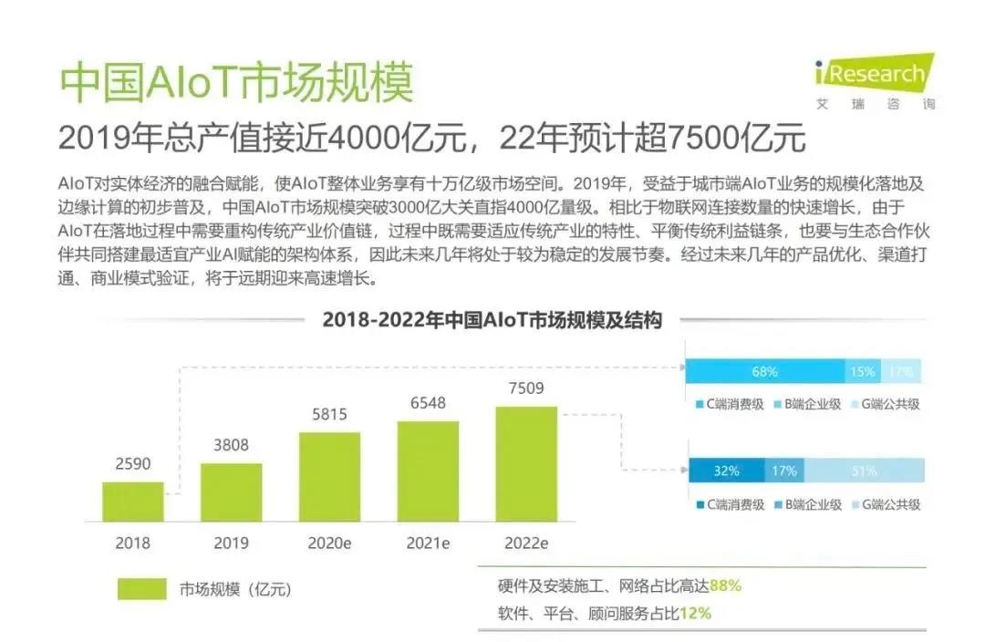 白皮書顯示,預計2025年我國物聯網連接數近200億個,萬物喚醒、海量連接將推動各行各業走上智能道路。2019年,受益于城市端AIoT業務的規模化落地及邊緣計算的初步普及,中國AIoT市場規模突破3000億大關直指4000億量級,由于AIoT在落地過程中需要重構傳統產業價值鏈,未來幾年發展節奏較為穩定。當前AIoT技術和商業快速落地,然而,認知智能層面的發展仍然較慢,行業標準與規范化不足,大規模物聯網設備的安全問題也有待重視。