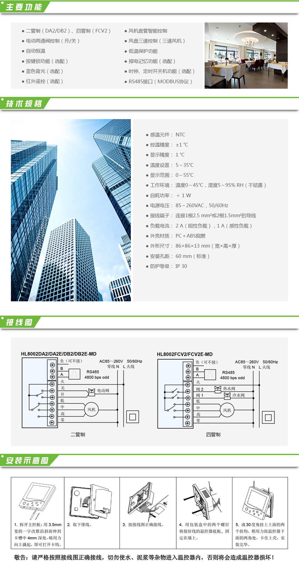 網絡溫控器HL8002-MD適用于中央空調風機盤管系統或風管道系統的室內溫度控制,通過室內溫度和設定溫度相比較,對空調系統末端的風機盤管、電動閥或電動球閥進行開啟和關閉控制達到調節室內溫度、舒適及節能的目的,可通過網絡(MODBUS協議)控制溫控器的工作。