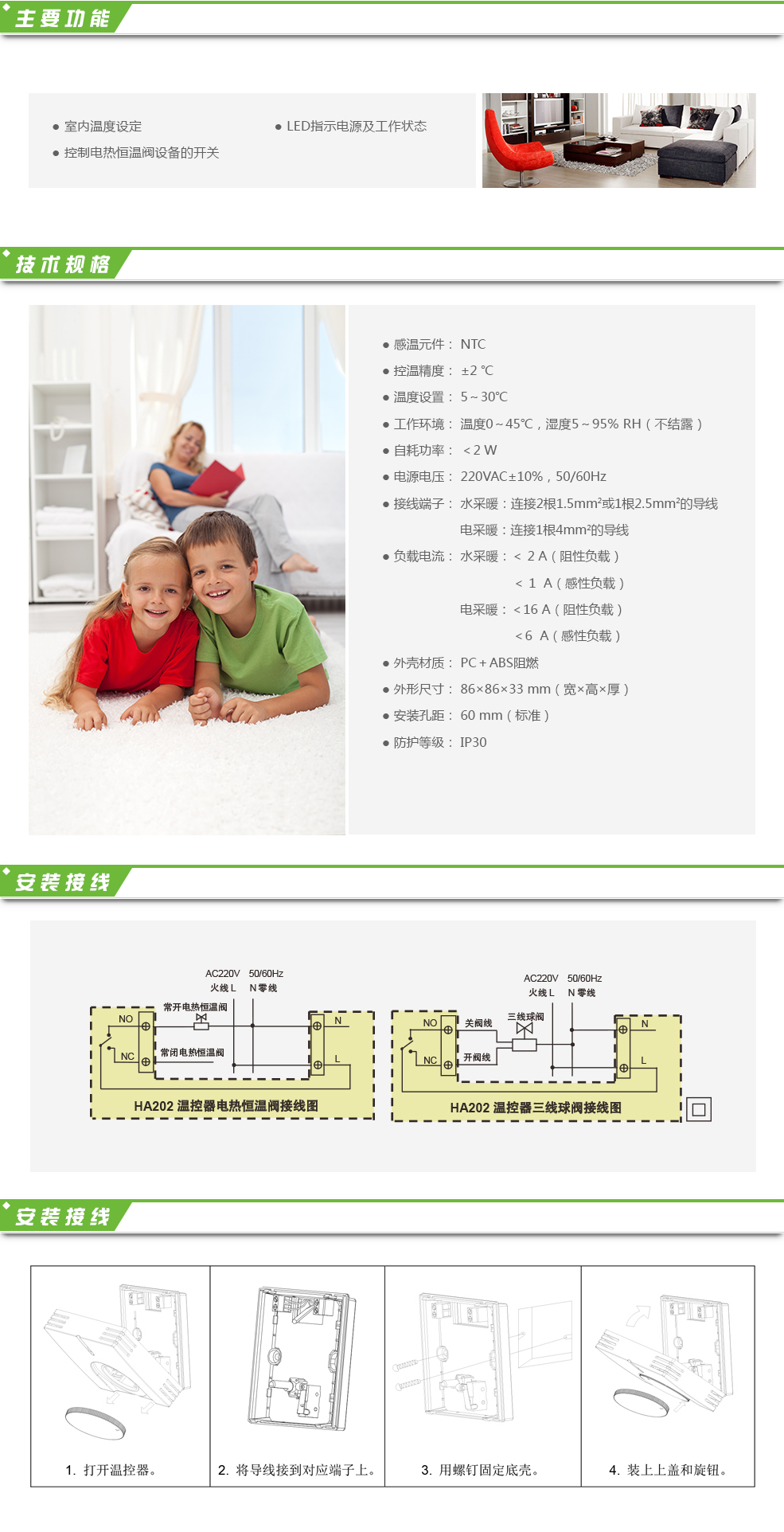 旋鈕式溫控器HA202/HA302是電子式供熱專用溫控器,使用操作簡單便捷,控制設(shè)備的啟停。當(dāng)室內(nèi)溫度低于設(shè)定溫度約2℃時(shí)啟動(dòng),LED指示工作狀態(tài),LED燈亮(為紅色)。當(dāng)室內(nèi)溫度達(dá)到設(shè)定溫度時(shí)關(guān)閉,LED燈變?yōu)榫G色,此時(shí)溫控器仍在工作。如果將旋鈕旋到OFF位置,則溫控器斷電,LED燈滅。