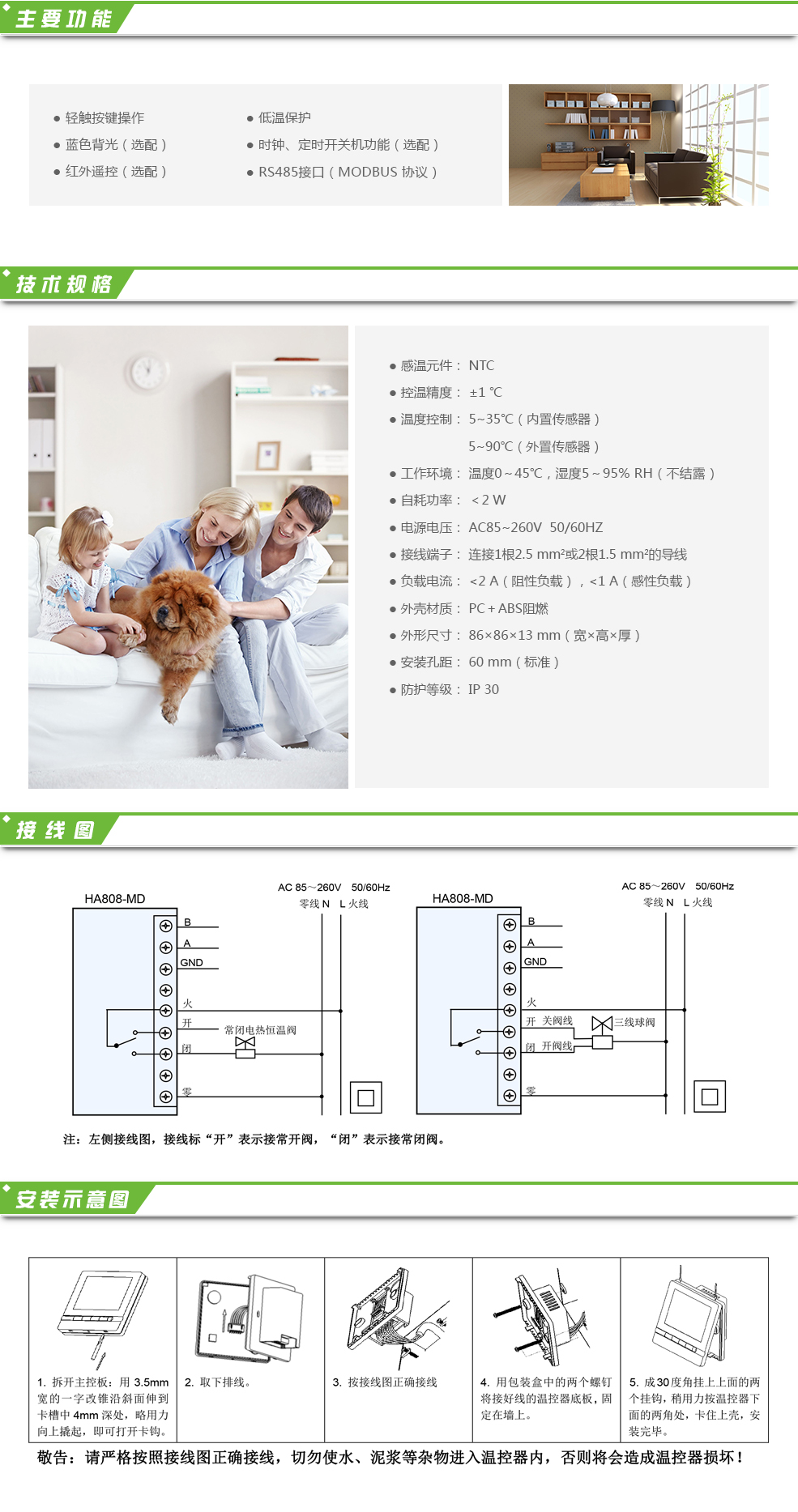 網(wǎng)絡(luò)型溫控器HA808-MD是適用于水采暖系統(tǒng)的采暖溫控器,用于家庭、辦公樓、寫字樓、學(xué)校等場所。通過控制電熱閥(或球閥)的開啟與關(guān)閉,達(dá)到調(diào)節(jié)室內(nèi)溫度的作用,同時(shí)具備低溫保護(hù)功能。可通過網(wǎng)絡(luò)(MODBUS 協(xié)議)實(shí)現(xiàn)遠(yuǎn)程數(shù)據(jù)采集和集中控制。