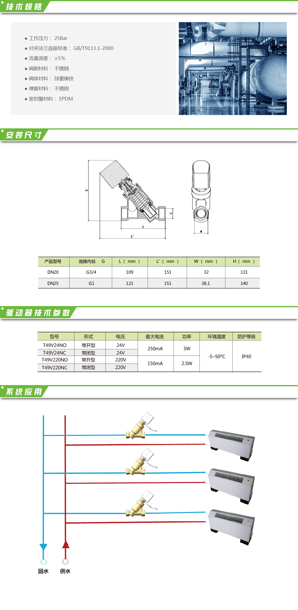 本系列產品主要用于解決暖通空調系統中的水力失調問題,是集動態平衡和電動二通與一體的產品,特點是抗干擾能力強,控制精度高,在系統負荷波動較大的變流量系統中優勢明顯。根據設備的輸入信號對電熱式開關驅動器進行動作,實現閥門的開關功能。主要適用于暖通空調系統末端空調設備,可對各環路的流量、溫度進行自動控制,實現合理利用能源。